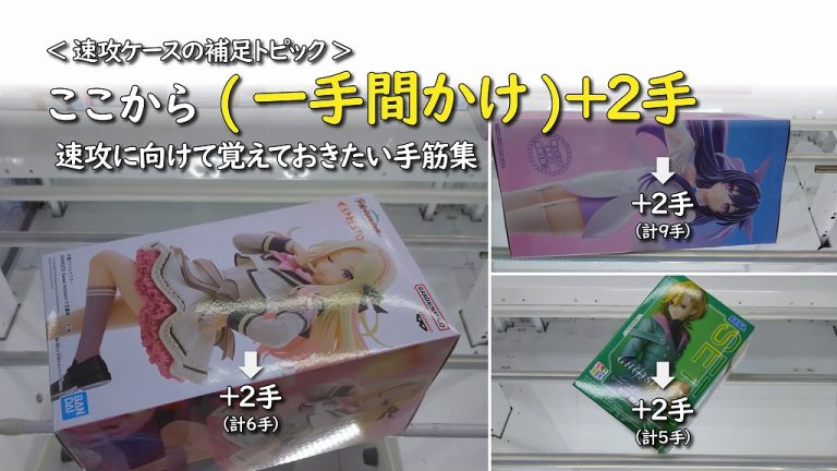 【5~9手目】左奥に 左アームを寄せて入れ、景品を元の形に戻します。重心手前かもしれないので、手前を動かすのは止めます。奥側を右に振っていきます。が、9手目で今度は奥側が右に倒れてしまいます。…重心どっちですか??
