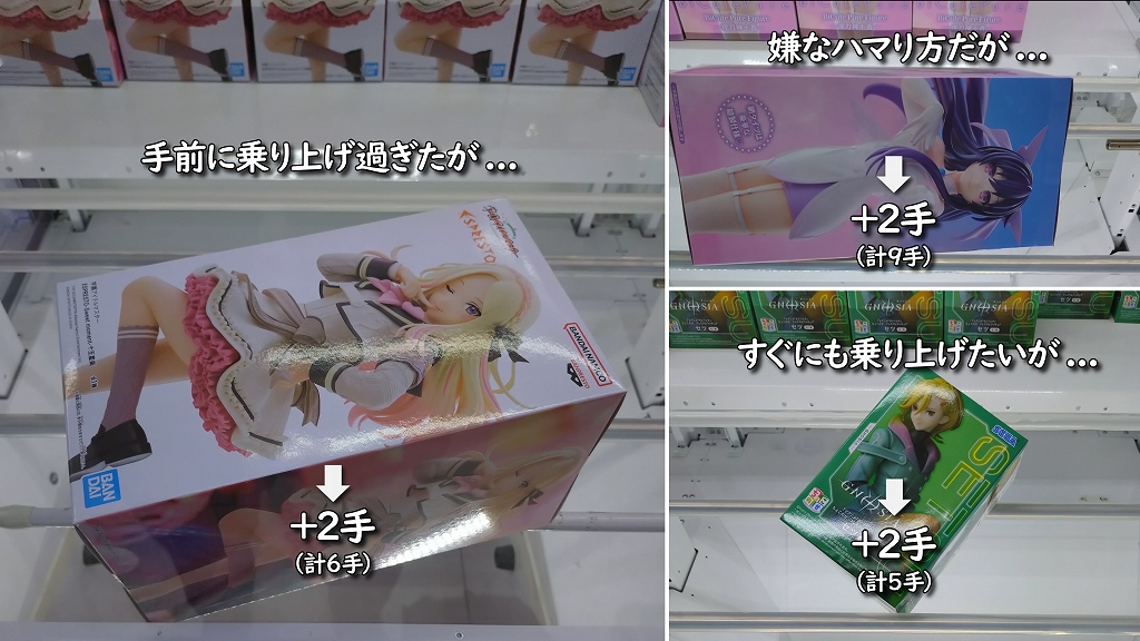 例えば、写真左側のケースは乗り上げ過ぎて、このまま奥の角を押しても落ちません。写真右下のケースは、この状態で奥側への乗り上げを狙っても、奥のバーでパタつく可能性があります。